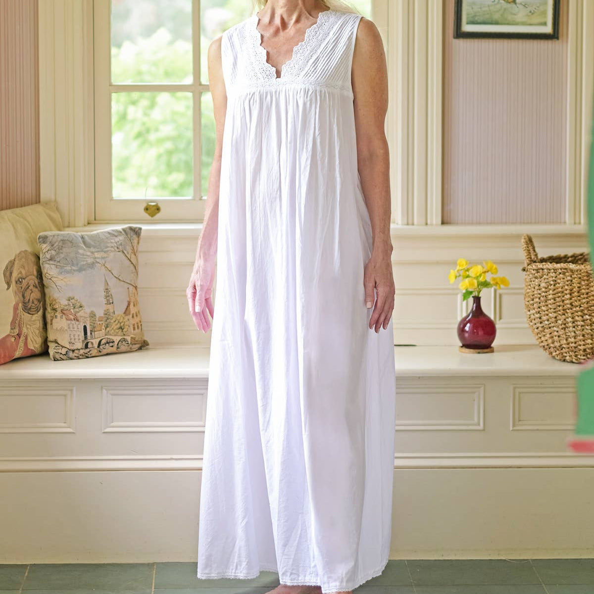 • 100% Cotton • Side seam pockets • Sarah is 5'5" and wearing a size small nighty measuring 52" • Slightly sheer • Machine wash on gentle cycle, hang to dry.