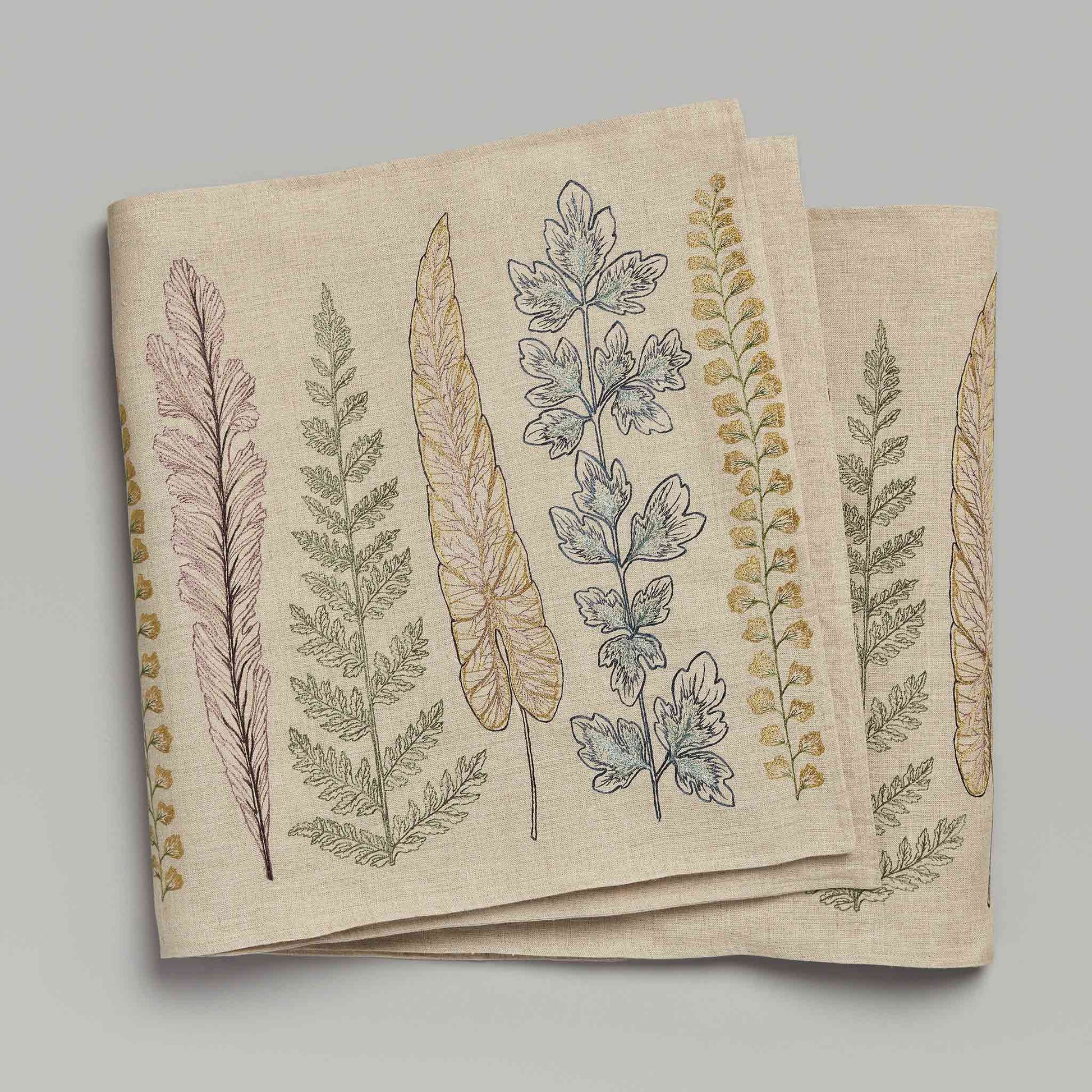 Drawn from nature, our fantastic fronds and large leaves bring botanical abundance to any table. We were inspired by Josef Frank’s exquisite botanical patterns for our own Plants design. Raw greens grace our runner, celebrating unsung garden heroes including ferns, herbs, and ivy. Create a verdant table setting with our Thistle and Poppy dinner napkins.